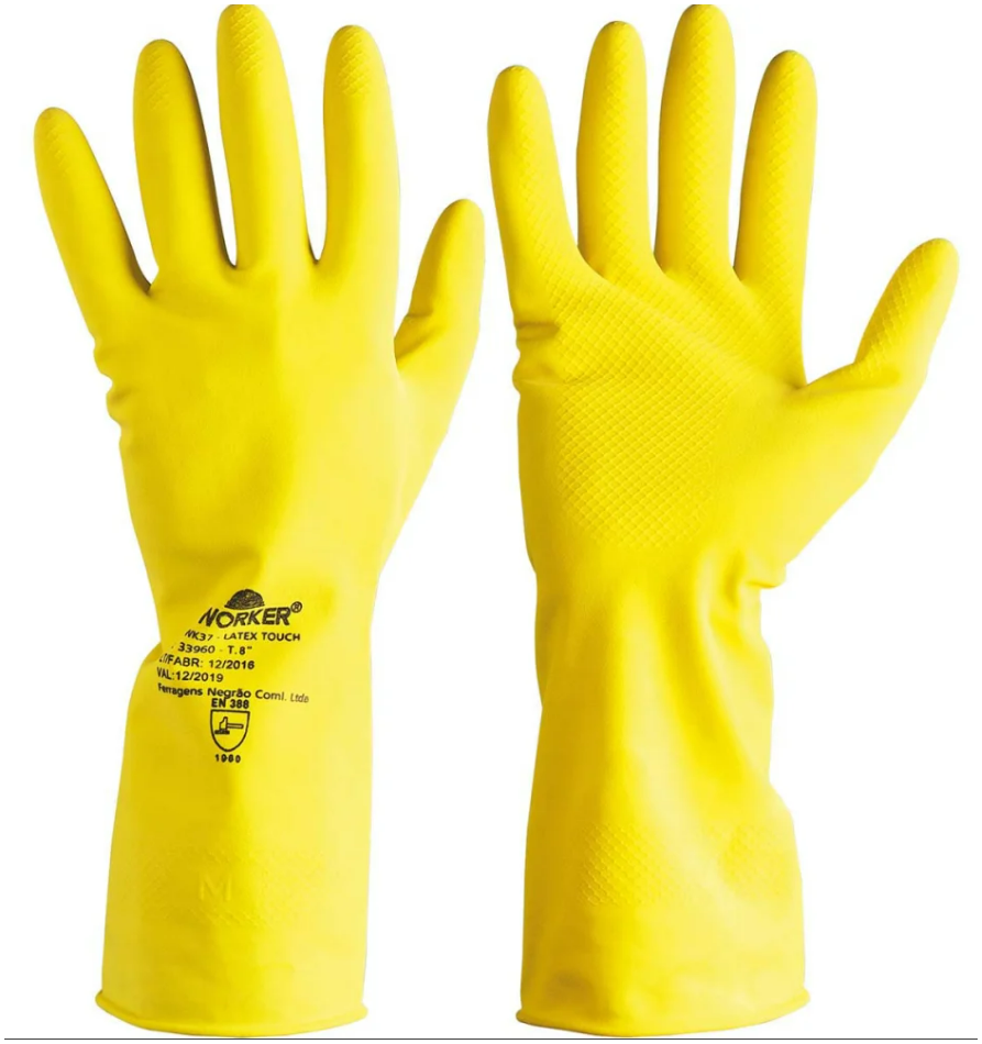 Luvas de látex amarelas, resistentes e confortáveis, ideais para garantir proteção durante a limpeza e manipulação de produtos na cozinha da tua hamburgueria.