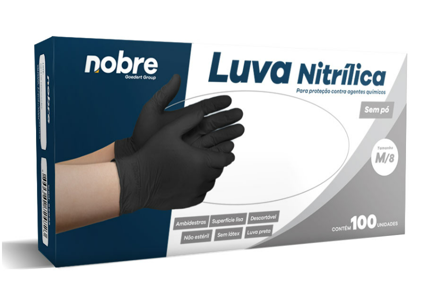 Luvas nitrílicas resistentes e sem pó, ideais para manipulação de alimentos e produtos químicos na cozinha da hamburgueria, oferecendo alta durabilidade e proteção.